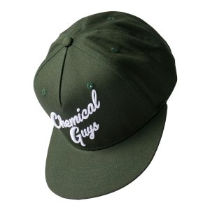 Upgrade your look with the fresh. new Snap-It-Back Olive Green Script Hat! Wear it frontwards or backwards to keep cool while detailing. and let the raised script lettering broadcast far & wide: you’re with Chemical Guys.